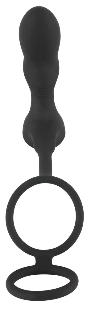 Vibro-Analplug 12,5 cm lang, Einführlänge 9 cm, Ø 1,9 cm bis 3,5 cm; Steglänge 9,5 cm; Penisring-Ø 3,9 cm, Hodenring-Ø 4,5 cm, beide dehnbar. Gewicht: 118 g. Silikon, PU, ABS.