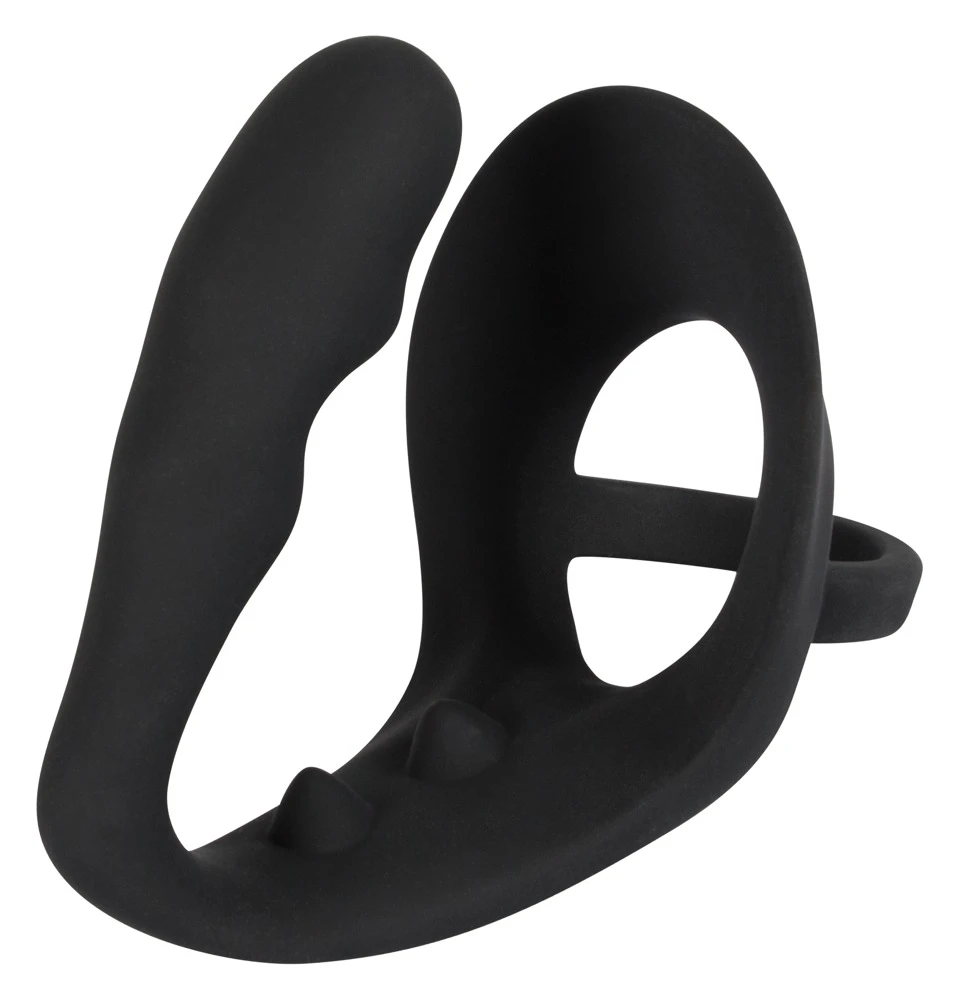 Dieser schwarze Penis-/Hodenring punktet nicht nur mit zusätzlichem Analplug, sondern auch mit reizvoll genopptem Perineumsteg. Hochgenuss pur!