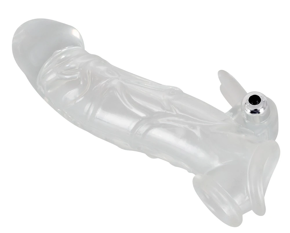 Transparente Penishülle Penis sleeve with extension and vibration von Crystal Clear mit massiver Eichel und markanter Äderung, die den Penis verdickt und um 5 cm verlängert. Die integrierte Hodenmanschette sorgt für einen sicheren Sitz und ein angenehm zupackendes Gefühl. Mit Klitorisreizer inklusive herausnehmbaren Vibrobullet. Inklusive Batterien.