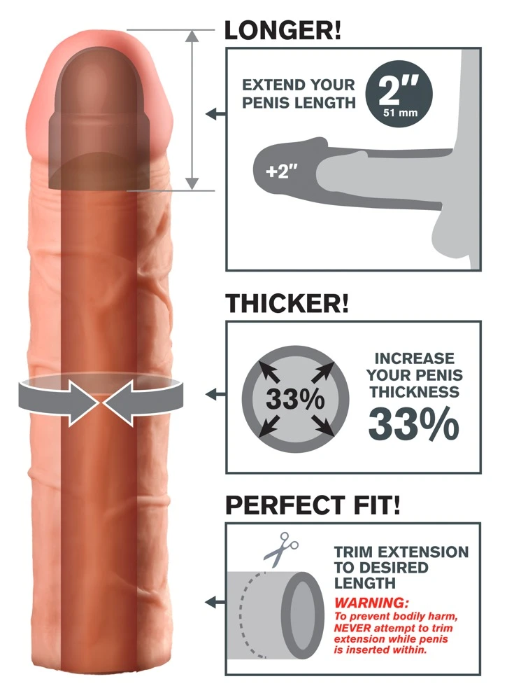 Penishülle mit starker Äderung und fest ausgepolsterter Eichel, die den Penis um 5,1 cm verlängert. Verdickt den Penis um 33% und sorgt gleichzeitig für Erektionsunterstützung. Kann individuell angepasst werden.