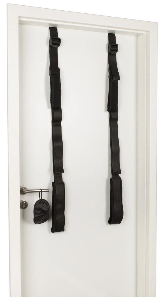 Liebesschaukel zum Befestigen an der Tür. Keine Montage benötigt. Bestehend aus zwei schwarzen, mehrfach verstellbaren Gurten mit Schlaufen für Arme und Beine an zwei Acrylstangen. Belastbar bis 120 kg. Inklusive Augenmaske.