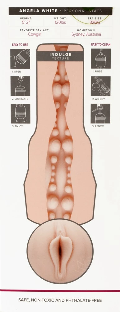 Dieser hautfarbene Masturbator ist eine getreue Nachbildung der Vagina von Angela White – mit Unterschrift von Angela auf dem Masturbator. Genießen Sie den unterschiedliche stark genoppten Lustkanal, der Ihre Lustnerven bei Reibung bis zum spritzigen Höhepunkt führt. Zur anschließenden Reinigung können Sie den Sleeve ganz einfach aus der perlmuttfarbenen Dose herausnehmen.
