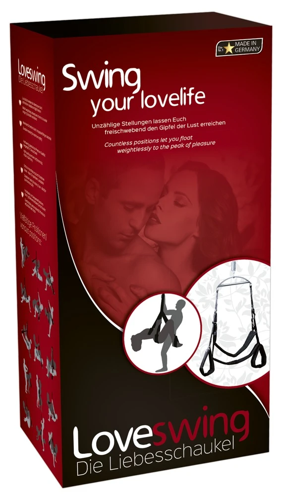 Genießen Sie die Liebe immer wieder neu – die unzähligen Stellungsvarianten, die mit der Liebesschaukel möglich sind, werden Sie begeistern! Liebesschaukel mit breiten, leicht verstellbaren Gurten. Komplett mit Spezialfeder. Belastbar bis 150 kg. Inklusive Gebrauchsanleitung sowie Stellungsvorschläge. Gurte: 100% Polyester, Polster: 100% Polypropylen, Schaumstoff: PE-Schaum, Stangenüberzug: 100% Baumwolle. Schieber: Metall, glanzvernickelt, Hakenband: 100% Polyamid, Halbring: Eisen, Karabiner: Metall, verzinkt, Kette und Zugfeder: Metall, galvanisch verzinkt. Unterlegscheibe: Stahl verzinkt, Mutter: Vollmetall.