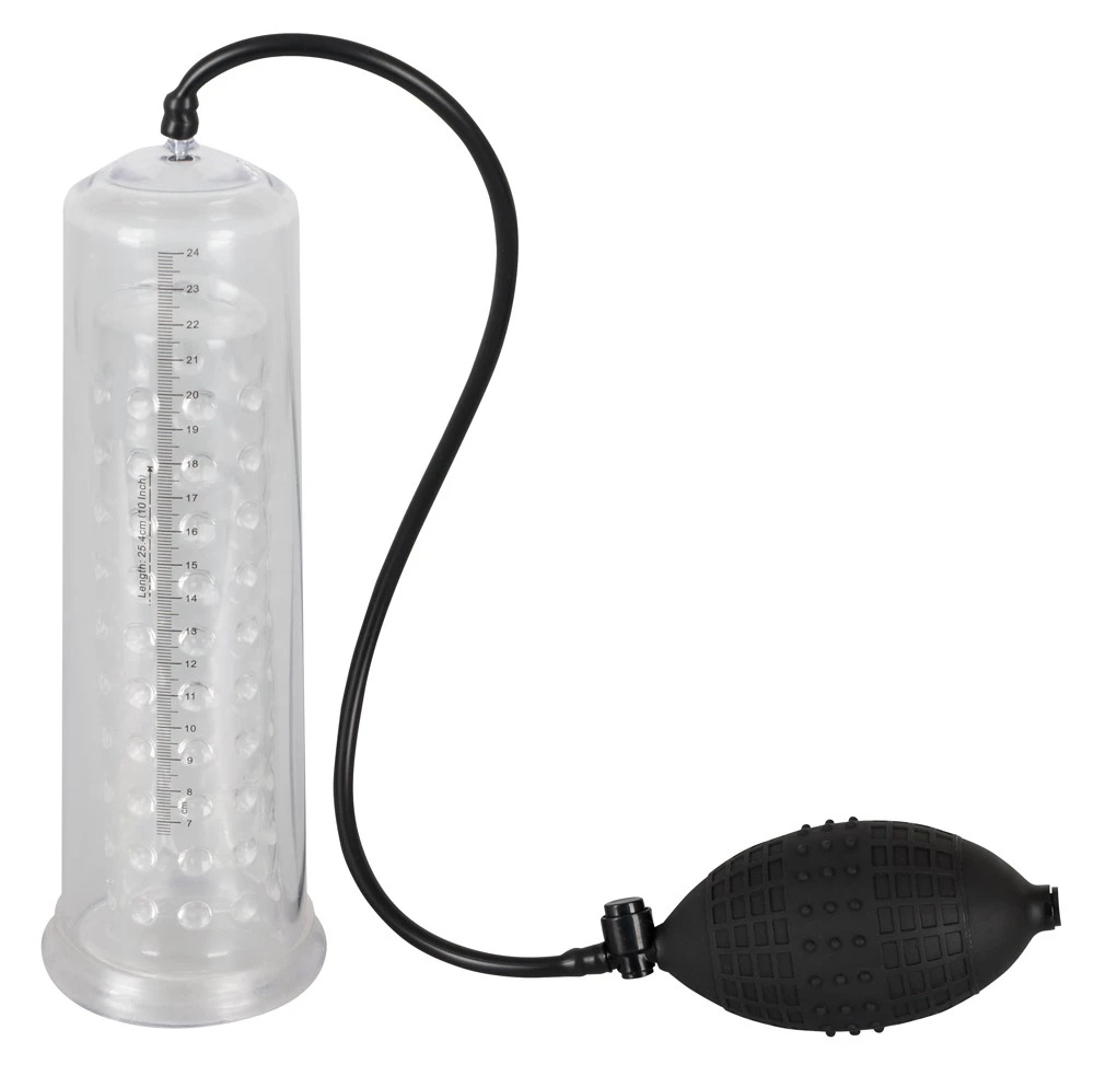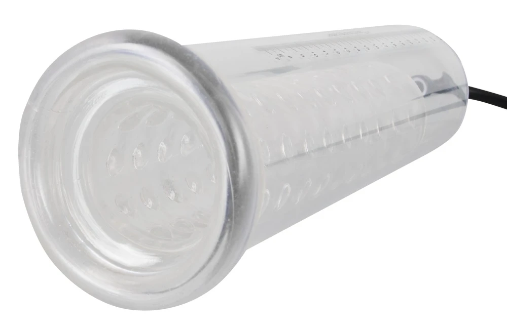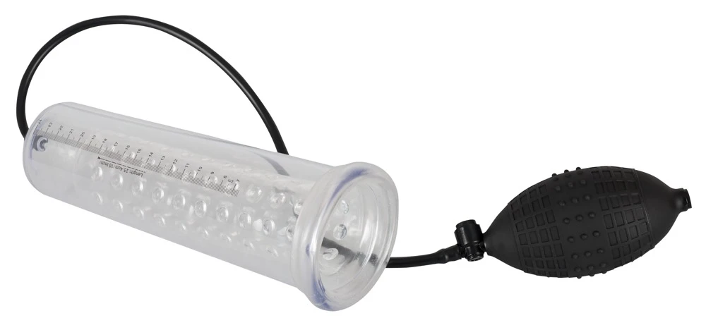 Der mit Gleitmittel eingecremte Penis wird in den transparenten Zylinder eingeführt und von der weichen Silikon-Manschette an der Wurzel fest umschlossen. Mit der handlichen Pumpe mit integriertem Ablassventil wird ein Unterdruck erzeugt und anhand des transparenten Zylinders mit der Messskala ist die jeweilige Größe des Penis zu erkennen. Zusätzlich wird der Penis mit einer transparenten Silikonsleeve mit Noppen stimuliert.