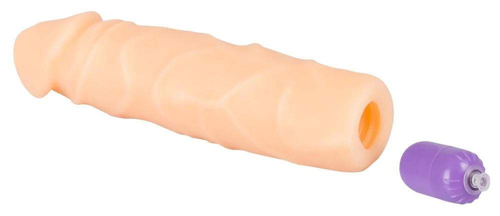Diese Penis Sleeve with Bullet von Nature Skin bringt den Penis in Topform für ausfüllende vibrierende Lustmomente zu zweit. Das kleine, kraftvolle Vibrobullet wird vorne in die Eichel der Sleeve eingesetzt und die Sleeve dann einfach über das Glied gestreift. Dank der 1-cm-Materialstärke ist der Penis sofort in Länge und Umfang vergrößert. Die Vibrationen des Bullets werden bei jedem Stoß durch Touch Control aktiviert, sobald der Penis das Vibrobullet berührt.