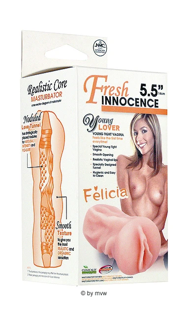 Felicia aus der Fresh Innocence Serie ist ein Masturbator in reizvoller Vagina-Optik. Eine spezielle Struktur mit Noppen und Lustrillen im Inneren, massiert und stimuliert den Penis besonders intensiv. Hergestellt aus LovecloneRX , einem hochwertigen, ungiftigem Material, das der menschlichen Haut in Weichheit und Elastizität sehr nah kommt, vermittelt Felicia ein unvergleichlich realistisches Gefühl. Außen mit einer wellenartigen Struktur versehen, liegt dieser Masturbator gut in der Hand, was die Anwendung bequem und einfach macht.