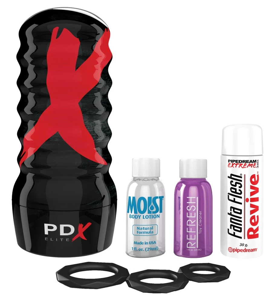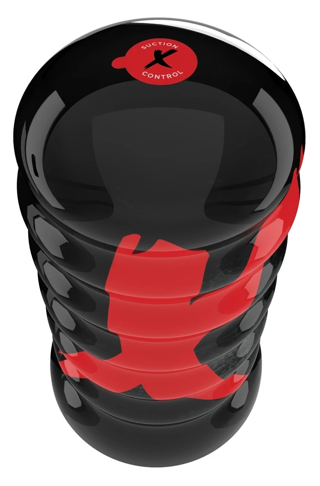 Hautfarbener, (zur Reinigung) herausnehmbarer Vagina-Masturbator in schwarzer Dose mit Vakuum-Öffnung für den Saugeffekt. Innen mit Reiznoppen. Gesamtlänge 18,6 cm, Ø dehnbar. TPR, ABS. Inkl. 3 Penisringe.