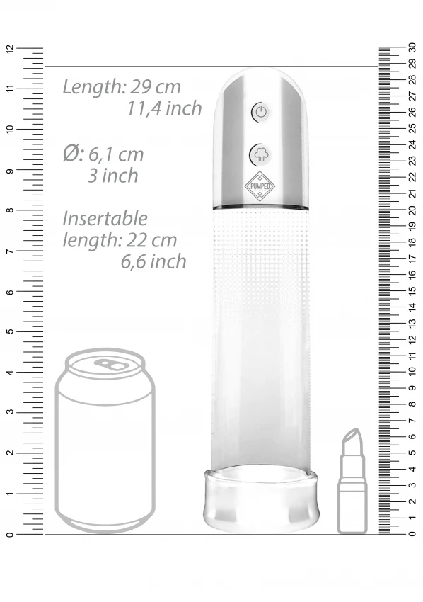 Mit einer Gesamtzylinderlänge von 20 cm (7.8″) und einem Durchmesser von 6 cm (2.36″) bereitet Ihnen diese hochwertige Pumpe zahlreiche Möglichkeiten, in zwei Richtungen zu wachsen! Die Einführhülse besteht aus glattem und flexiblem Silikon. Sie werden jedes Mal überrascht sein, wie groß Sie werden können! Auf Knopfdruck erzeugt diese extrem leistungsstarke Pumpe ein superstarkes Vakuum die Ihnen eine schnelle und kraftvolle Erektion ermöglicht. Die Öffnung aus weichem Silikon dichtet bequem ab. Ein Penisring aus Silikon liegt der Pumpe bei.