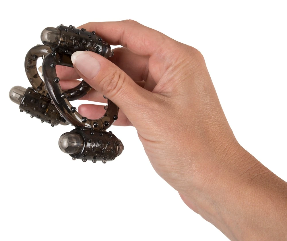 Zwei zusammenhängende, genoppte Penis/Hodenringe inlusive drei herausnehmbare Vibro-Eier, jedes separat per Knopfdruck an- und auszuschalten. Transparent/Schwarz. Penisring Ø 3 cm (dehnbar), Hodenring Ø 4 cm (dehnbar). Material: TPE, ABS. Inklusive Batterien.