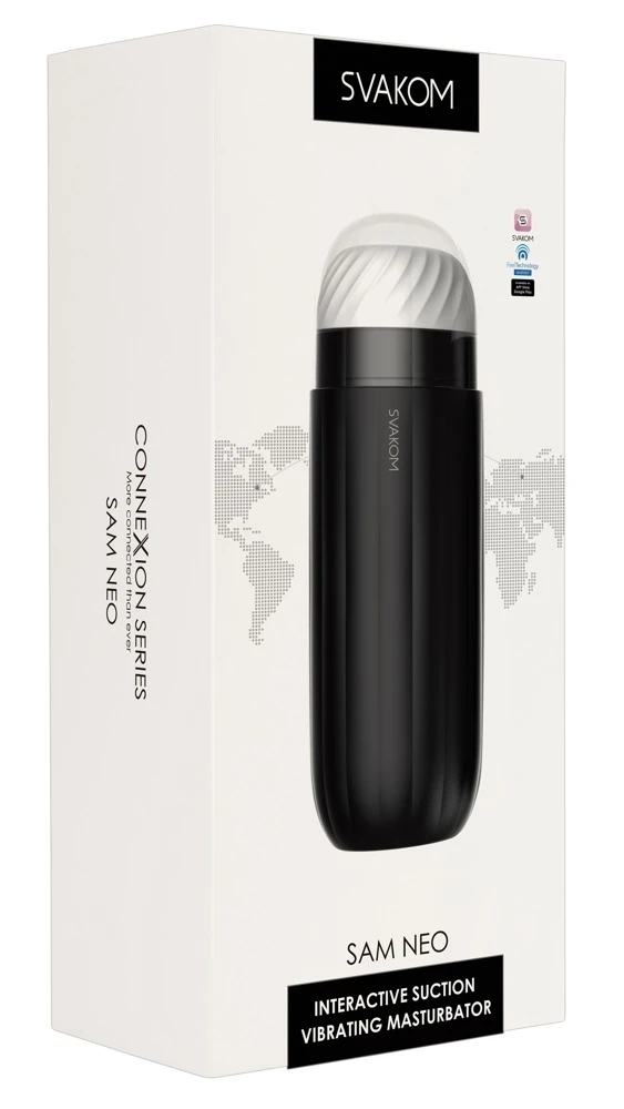 Vollautomatischer Masturbator Sam Neo von Svakom mit herausnehmbarer, hautähnlicher Softsleeve unter dem Schutzdeckel, die innen mit Rillen und Noppen aufregend strukturiert ist. Mit Saugfunktion und Vibration in jeweils 5 Modi. Alles steuerbar direkt am Toy oder per FeelConnect-3-App mit 3 neuen Hauptfunktionen: Long Distance Control (jederzeit von überall auf der Welt), Verbindung zu interaktiven 2D-Videos und interaktive Webcam-Funktion. Wiederaufladbar – inklusive USB-Ladekabel.