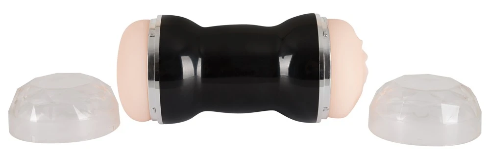Hautfarbener Doppel-Masturbator in schwarz-silberfarbener Hülle. Der strukturierte Lustkanal ist beidseitig geöffnet – auf der einen Seite in Vaginaform, auf der anderen in Anusform. Gesamtlänge 20 cm, Innen-Ø ca. 4 cm. Zur Anwendung wird Gleitmittel empfohlen. Die Lusthöhle kann zum Reinigen aus der Dose gezogen werden. Material: TPR, Hülle ABS.