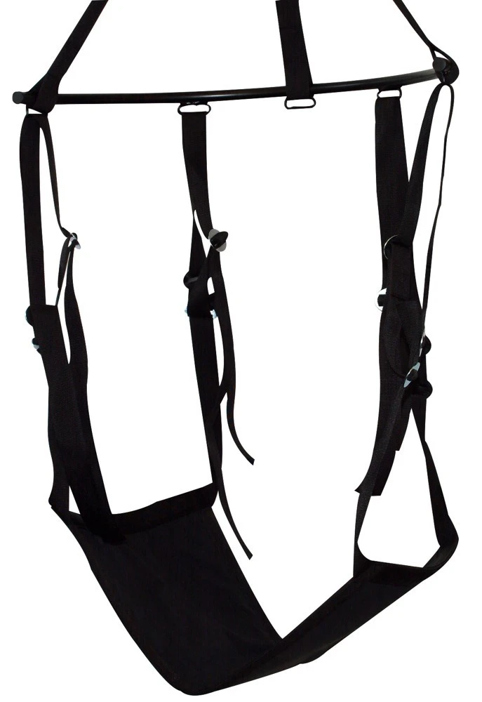 Schwarze Liebesschaukel mit großer Auflagefläche und Hand- und Fußschlaufen aus reißfestem Material, längenverstellbar. Ermöglichen verschiedene Sexpositionen, die sonst nicht möglich wären. Ohne Montage-Zubehör. Belastbar bis 100 kg.