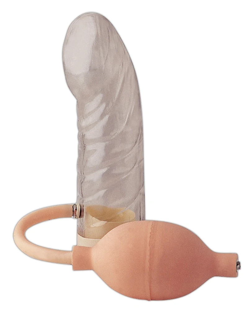 Transparentes Potenz-Kondom mit handlicher Vakuum-Pumpe. 17,2 cm tief, Ø innen 5,2 cm, Ø außen 5,4 cm. Ø dehnbare Sleeve-Öffnung 4 cm. Passend für alle Penis-Größen. Material: ABS, PVC, Latex (hergestellt unter der Verwendung von Naturkautschuklatex, der Allergien verursachen kann).