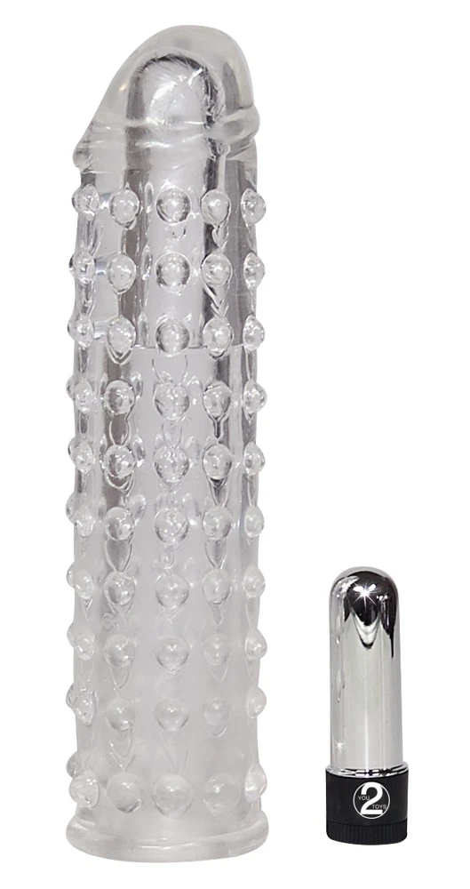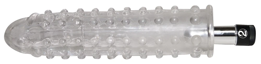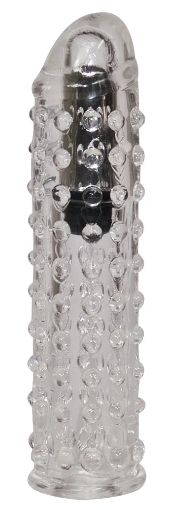 Transparente, prall genoppte Penishülle inklusive beiliegendem Vibroei, das in der Spitze platziert wird.